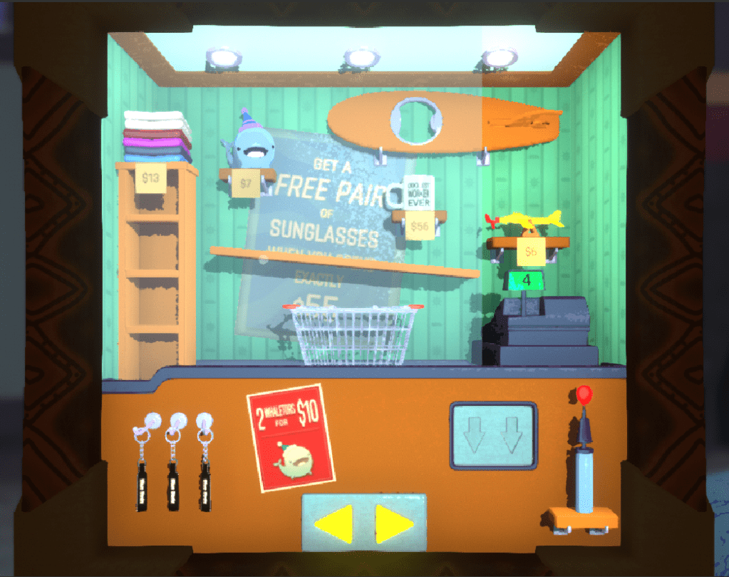 The last and biggest change involves the win condition for the room. Previously, players had to complete a math puzzle of sorts where they had to get the exact price we asked for using the various objects in the room. Now, they just have to figure out how to collect one of each object in the room which is counted down on the cash register. We think that this streamlines the room and doesn’t just make a math puzzle, which no one likes anyways. I still think the Gift Shop is one of our best looking rooms, but we just need the room to feel as good to play around with.