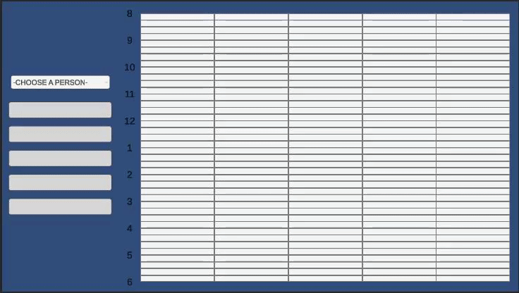 I first got to work creating the calendar itself. I limited myself to the 8am-6pm timeframe and weekdays because I felt it would be more manageable and would fit into the office vibe the game would likely have. The grid is built through code and each space is its own button that I modified to register both click and release. I liked the simplicity some calendars have with clicking and dragging to instantly block out time for a new appointment, so I managed to get that up and running first as seen below.