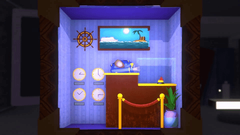 The ship is comprised of a variety of small vignette rooms based on cruise ship rooms, each with its own personality and puzzles. To traverse the ship, the player will rotate a box of impossible space that holds all of the rooms (as shown in a gif at the top of the page). We worked to balance absurdity and understandability to make for a game that’s easy and exciting to explore.