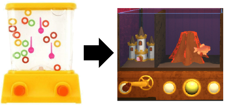 Interactions are simple, inspired by analog toys such as this bubble ring toss. Players use the controller to push buttons, pull levers, and spin wheels to see how objects are affected in satisfying and often humorous ways. Each room has a goal that must be inferred and completed in order to add to the Fun Meter, which will allow the player to leave the box once full.